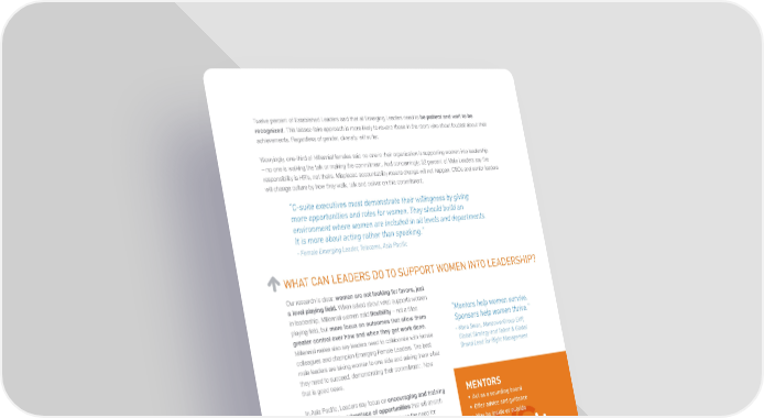 Twelve percent of Established Leaders said that all Emerging Leaders need to be patient and wait to be recognized. This laissez-faire approach is more likely to reward those in the room who shout loudest about their achievements. Regardless of gender, diversity will suffer. Worryingly, one-third of Millennial females said no one in their organization is supporting women into leadership – no one is walking the talk or making the commitment. And concerningly, 32 percent of Male Leaders say the responsibility is HR’s, not theirs. Misplaced accountability means change will not happen. CEOs and senior leaders will change culture by how they walk, talk and deliver on this commitment. “C-suite executives must demonstrate their willingness by giving more opportunities and roles for women. They should build an environment where women are included in all levels and departments. It is more about acting rather than speaking.” - Female Emerging Leader, Telecoms, Asia Pacific WHAT CAN LEADERS DO TO SUPPORT WOMEN INTO LEADERSHIP? Our research is clear: women are not looking for favors, just a level playing field. When asked about what supports women in leadership, Millennial women said flexibility – not a tilted “Mentors help women survive. playing field, but more focus on outcomes that allow them Sponsors help women thrive.” greater control over how and when they get work done. - Mara Swan, ManpowerGroup EVP, Millennial males also say leaders need to collaborate with female Global Strategy and Talent & Global colleagues and champion Emerging Female Leaders. The best Brand Lead for Right Management male leaders are taking women to one side and asking them what they need to succeed, demonstrating their commitment. Now that is good news. In Asia Pacific, Leaders say focus on encouraging and training MENTORS women to take advantage of opportunities that will stretch • Act as a sounding board and develop leadership strengths. They stress the need for • Offer advice and guidance companies to adopt a culture of shared power, driven from • May be inside or outside the top. the organization Gen X and Boomer females most value workplace flexibility and are most frustrated by past challenges of measuring performance SPONSORS VS through presenteeism versus outcomes, or as one U.S. Leader • Offer individual guidance put it, “butts in chairs.” They want leaders walking the talk and • Offer critical feedback taking responsibility for creating a culture of Conscious Inclusion. • Inside the company They also want mentors and training but while mentors may • Most importantly, stick their make women feel more comfortable or act as a sounding neck out and publicly support board, they do not help them move ahead. Sponsorship the individual however consciously advocates for women in the boardroom. This is a critical distinction for leaders to act upon. A Practical Guide to Accelerating More Women Into Leadership | 9