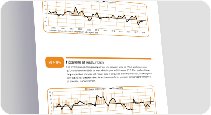 ( ) Services publics et sociaux 0 -1 % Avec un solde net de -1%, les perspectives d’embauche entre juillet et septembre demeureront limitées. C’est la quatrième prévision négative consécutive dans ce secteur. Bien qu’affichant une certaine stabilité d’un trimestre sur l’autre, les intentions d’embauche diminuent de 7 points d’une année sur l’autre. 20 PrPrévision Nette d’Emploiévision Nette d’Emploi Données CVSDonnées CVS 15 10 5 0 -5 -10 -15 2005 2006 2007 2008 2009 2010 2011 2012 2013 2014 2015 2016 L’absence de barre équivaut à une prévision nette égale à zéro ( ) Hôtellerie et restauration +8 -1 % Les employeurs de la région rapportent une prévision nette de -1% et n’anticipent donc e qu’une variation modérée de leurs effectifs pour le 3 trimestre 2016. Bien que le solde net de perspectives d’emploi soit négatif pour le cinquième trimestre consécutif, les employeurs font état d’intentions d’embauche en hausse de 5 et 4 points en comparaisons trimestrielle et annuelle, respectivement. 20 PrPrévision Nette d’Emploiévision Nette d’Emploi Données CVSDonnées CVS 15 10 5 0 5 10 15 20 2005 2006 2007 2008 2009 2010 2011 2012 2013 2014 2015 2016 L’absence de barre équivaut à une prévision nette égale à zéro 10 Baromètre Manpower des perspectives d’emploi France