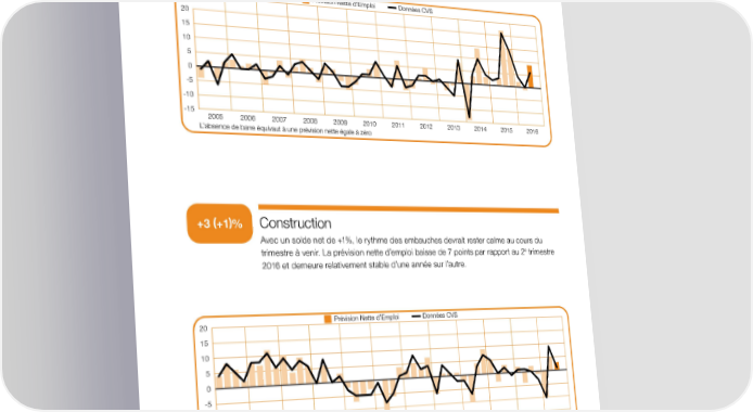( ) Agriculture, chasse, sylviculture et pêche +9 +6 % Avec une prévision nette de +6%, l’horizon s’éclaircit au prochain trimestre pour les demandeurs d’emploi du secteur. Tandis que la prévision nette d’emploi gagne 7 points par rapport au trimestre précédent, elle enregistre un repli de 13 points en comparaison annuelle. 25 PrPrévision Nette d’Emploiévision Nette d’Emploi Données CVSDonnées CVS 20 15 10 5 0 -5 -10 -15 2005 2006 2007 2008 2009 2010 2011 2012 2013 2014 2015 2016 L’absence de barre équivaut à une prévision nette égale à zéro ( ) Construction +3 +1 % Avec un solde net de +1%, le rythme des embauches devrait rester calme au cours du e trimestre à venir. La prévision nette d’emploi baisse de 7 points par rapport au 2 trimestre 2016 et demeure relativement stable d’une année sur l’autre. 20 PrPrévision Nette d’Emploiévision Nette d’Emploi Données CVSDonnées CVS 15 10 5 0 -5 -10 -15 2005 2006 2007 2008 2009 2010 2011 2012 2013 2014 2015 2016 L’absence de barre équivaut à une prévision nette égale à zéro Baromètre Manpower des perspectives d’emploi France 7