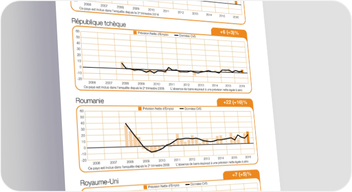 Portugal +10% 60 PrPrévision Nette d’Emploiévision Nette d’Emploi Données CVSDonnées CVS 50 40 30 20 10 0 -10 -20 2006 2007 2008 2009 2010 2011 2012 2013 2014 2015 2016 e Ce pays est inclus dans l'enquête depuis le 3 trimestre 2016 République tchèque +6 (+3)% 60 PrPrévision Nette d’Emploiévision Nette d’Emploi Données CVSDonnées CVS 50 40 30 20 10 0 -10 -20 2006 2007 2008 2009 2010 2011 2012 2013 2014 2015 2016 e Ce pays est inclus dans l'enquête depuis le 2 trimestre 2008 L'absence de barre équivaut à une prévision nette égale à zéro Roumanie +22 (+16)% 60 PrPrévision Nette d’Emploiévision Nette d’Emploi Données CVSDonnées CVS 50 40 30 20 10 0 -10 -20 200622007 00820092010 2011 2012 2013 2014 2015 2016 e Ce pays est inclus dans l'enquête depuis le 2 trimestre 2008 L'absence de barre équivaut à une prévision nette égale à zéro Royaume-Uni +7 (+5)% 60 PrPrévision Nette d’Emploiévision Nette d’Emploi Données CVSDonnées CVS 50 40 30 20 10 0 -10 -20 2006 2007 2008 2009 2010 2011 2012 2013 2014 2015 2016 L'absence de barre équivaut à une prévision nette égale à zéro 26 Baromètre Manpower des perspectives d’emploi France