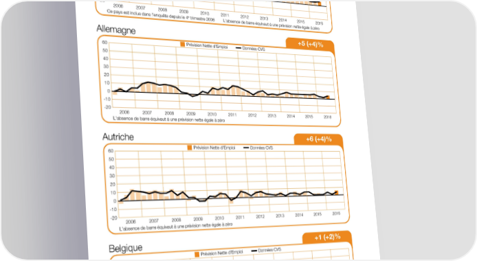 Afrique du Sud +6 (+6)% 60 PrPrévision Nette d’Emploiévision Nette d’Emploi Données CVSDonnées CVS 50 40 30 20 10 0 -10 -20 2006 2007 2008 2009 2010 2011 2012 2013 2014 2015 2016 e Ce pays est inclus dans l'enquête depuis le 4 trimestre 2006 L'absence de barre équivaut à une prévision nette égale à zéro Allemagne +5 (+4)% 60 PrPrévision Nette d’Emploiévision Nette d’Emploi Données CVSDonnées CVS 50 40 30 20 10 0 -10 -20 2006 2007 2008 2009 2010 2011 2012 2013 2014 2015 2016 L'absence de barre équivaut à une prévision nette égale à zéro Autriche +6 (+4)% 60 PrPrévision Nette d’Emploiévision Nette d’Emploi Données CVSDonnées CVS 50 40 30 20 10 0 -10 -20 2006 2007 2008 2009 2010 2011 2012 2013 2014 2015 2016 L'absence de barre équivaut à une prévision nette égale à zéro Belgique +1 (+2)% 60 PrPrévision Nette d’Emploiévision Nette d’Emploi Données CVSDonnées CVS 50 40 30 20 10 0 -10 -20 2006 2007 2008 2009 2010 2011 2012 2013 2014 2015 2016 L'absence de barre équivaut à une prévision nette égale à zéro 22 Baromètre Manpower des perspectives d’emploi France