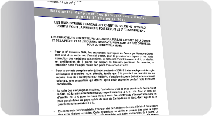 À propos de l’Étude e Le Baromètre Manpower des perspectives d’emploi pour le 3 trimestre 2016 a été réalisé dans 43 pays et territoires, du 20 avril au 3 mai 2016, avec près de 59 000 employeurs issus d’entreprises privées et d’organismes publics, dont 1 002 employeurs en France. L’étude analyse les données obtenues en réponse à une unique question : « Comment anticipez-vous l’évolution des effectifs de votre entreprise au cours du prochain trimestre, jusqu’à fin septembre 2016, par rapport au trimestre actuel ? » Le chiffre de « prévision nette d’emploi » utilisé dans ce Baromètre est le résultat de la soustraction entre le pourcentage d'employeurs anticipant une hausse de leurs effectifs et le pourcentage d’employeurs anticipant une baisse. Il s’agit donc d’un solde net – pouvant être positif ou négatif – de perspectives d’emploi. Seule étude de ce type, cette enquête prospective interroge des entreprises qui ne sont pas issues du fichier des clients de Manpower. Les données sont corrigées des variations saisonnières afin de refléter au mieux la réalité des perspectives. Ces corrections permettent d’analyser les données en lissant l’impact des fluctuations saisonnières, qui se reproduisent normalement aux mêmes périodes chaque année. Les données ainsi corrigées sont donc plus représentatives sur le long terme. Précisons que les chiffres pour la Finlande ne e sont pas corrigés des variations saisonnières. Le Portugal étant couvert pour la première fois depuis le 3 trimestre 2016, les données corrigées des variations saisonnières ne sont pas encore disponibles. Les résultats complets de l’enquête pour les 43 pays sont disponibles via notre nouvel outil interactif « Manpower Employment Outlook Explorer ». http://manpowergroupsolutions.com/DataExplorer/ À propos de ManpowerGroup ManpowerGroup® (NYSE : MAN) s’est imposé depuis près de 70 ans comme l’expert mondial des services en ressources humaines et créateur de solutions innovantes pour l’emploi. À ce titre, nous proposons chaque jour à plus de 600 000 hommes et femmes des emplois gratifiants dans de multiples secteurs d’activité et domaines de compétence. Notre famille de marques - Manpower®, Experis®, Right Management ® et ManpowerGroup® Solutions – aide plus de 400 000 clients de 80 pays et territoires à répondre à leurs besoins en ressources humaines, grâce à des solutions complètes conçues pour recruter, gérer et développer les talents dont ils ont besoin. En 2016, ManpowerGroup figure pour la sixième année consécutive parmi les sociétés les plus éthiques au monde (« World’s Most Ethical Companies »). Le Groupe figure également au classement Fortune des entreprises les plus admirées (« Most Admired Companies »), confirmant ainsi sa réputation inégalée au sein du secteur. Découvrez comment ManpowerGroup dynamise humainement le monde du travail : www.manpowergroup.com À propos de ManpowerGroup France ManpowerGroup, Experts RH pour un monde de défis, accompagne les entreprises dans la définition et la mise en œuvre de leur stratégie RH. Ses prestations incluent le conseil en transformation RH suivi de son exécution par le recours à des solutions de : - Gestion de la flexibilité et recrutement, sous la marque Manpower - Recrutement de cadres supérieurs et confirmés sous la marque Experis Executive - Mise à disposition d'expertises dans le domaine des technologies de l'information, en délégation de personnel ou en recrutement permanent, sous la marque Experis IT - Formation et développement des compétences (présentiel et e-learning) et gestion externalisée de la formation, sous la marque FuturSkill - Transformation des métiers et des services : Conseil en Stratégie RH, mise en œuvre et solutions de gestion externalisée RH, sous la marque ManpowerGroup Solutions - Externalisation des services aux infrastructures IT et End User Support sous la marque Proservia - Solutions d’optimisation du capital humain en Management des talents et des carrières, sous la marque Right Management. ManpowerGroup emploie 7 500 collaborateurs permanents en France, pour un chiffre d’affaires de 4,2 milliards d’euros en 2015. http://www.manpowergroup.fr/ Contact Presse Stéphanie Prévost – 01 57 66 11 40 / 06 27 02 32 12 [email protected] e Baromètre Manpower des perspectives d’emploi — 3 trimestre 2016 6/6