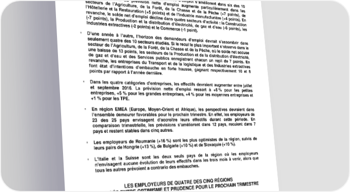 l’Agriculture, de la Forêt, de la Chasse et de la Pêche (+6 %) et de l’Industrie manufacturière (+5 %), suivis par leurs homologues des secteurs des Activités financières et des services aux entreprises (+3 %), du Transport et de la logistique (+2 %) et de la Construction (+1 %). Inversement, les employeurs du secteur de la Production et de la distribution d’électricité, de gaz et d’eau (-5 %) sont ceux qui prévoient les réductions d’effectifs les plus importantes pour les trois mois à venir, talonnés par ceux des Industries extractives (-3 %), du Commerce (-2 %), des Services publics (-1 %) et de l’Hôtellerie-Restauration (-1 %). En comparaison trimestrielle, les perspectives d’emploi s’améliorent dans six des 10 secteurs étudiés. La prévision nette d’emploi augmente particulièrement dans les secteurs de l’Agriculture, de la Forêt, de la Chasse et de la Pêche (+7 points), de l’Hôtellerie et la Restauration (+5 points) et de l’Industrie manufacturière (+4 points). En revanche, le solde net d’emploi décline dans quatre secteurs d’activité : la Construction (-7 points), la Production et la distribution d’électricité, de gaz et d’eau (-6 points), les Industries extractives (-2 points) et le Commerce (-1 point). D’une année à l’autre, l’horizon des demandeurs d’emploi devrait s’assombrir dans seulement quatre des 10 secteurs étudiés. Si le recul le plus important s’observe dans le secteur de l’Agriculture, de la Forêt, de la Chasse et de la Pêche, où le solde net accuse une baisse de 13 points, les secteurs de la Production et de la distribution d’électricité, de gaz et d’eau et des Services publics enregistrent chacun un repli de 7 points. En revanche, les entreprises du Transport et de la logistique et des Industries extractives font état d’intentions d’embauche en forte hausse, gagnant respectivement 10 et 8 points par rapport à l’année dernière. Dans les quatre catégories d’entreprises, les effectifs devraient augmenter entre juillet et septembre 2016. La prévision nette d’emploi ressort à +6 % pour les petites entreprises, +5 % pour les grandes entreprises, +4 % pour les moyennes entreprises et +1 % pour les TPE. En région EMEA (Europe, Moyen-Orient et Afrique), les perspectives devraient dans l’ensemble demeurer favorables pour le prochain trimestre. En effet, les employeurs de 23 des 25 pays envisagent d’accroître leurs effectifs durant cette période. En comparaison trimestrielle, les prévisions s’améliorent dans 12 pays, reculent dans 7 pays et restent stables dans cinq autres. Les employeurs de Roumanie (+16 %) sont les plus optimistes de la région, suivis de leurs pairs de Hongrie (+13 %), de Bulgarie (+10 %) et de Slovaquie (+10 %). L’Italie et la Suisse sont les deux seuls pays de la région où les employeurs n’envisagent aucune évolution de leurs effectifs dans les trois mois à venir, alors que tous les autres prévoient a contrario des embauches. LES EMPLOYEURS DE QUATRE DES CINQ RÉGIONS PARTAGÉS ENTRE OPTIMISME ET PRUDENCE POUR LE PROCHAIN TRIMESTRE NB : Les données suivantes sont corrigées des variations saisonnières. Pour la période comprise entre juillet et septembre 2016, les employeurs les plus optimistes sont ceux du Centre-Est (avec une prévision nette d’emploi de +5 %) et leurs homologues de la région Sud, où le solde net s’établit à +3 %. Les employeurs du Nord et du Centre- Ouest anticipent un marché de l’emploi peu dynamique (0 %) pour les trois mois à venir, tandis que ceux d’Île-de-France prévoient des réductions d’effectifs, avec un solde net d’emploi à - 1 %. e Baromètre Manpower des perspectives d’emploi — 3 trimestre 2016 2/6