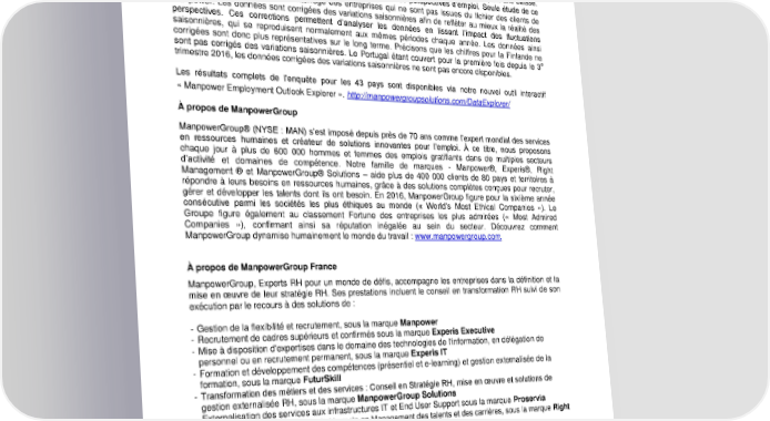 À propos de l’Étude e Le Baromètre Manpower des perspectives d’emploi pour le 3 trimestre 2016 a été réalisé dans 43 pays et territoires, du 20 avril au 3 mai 2016, avec près de 59 000 employeurs issus d’entreprises privées et d’organismes publics, dont 1 002 employeurs en France. L’étude analyse les données obtenues en réponse à une unique question : « Comment anticipez-vous l’évolution des effectifs de votre entreprise au cours du prochain trimestre, jusqu’à fin septembre 2016, par rapport au trimestre actuel ? » Le chiffre de « prévision nette d’emploi » utilisé dans ce Baromètre est le résultat de la soustraction entre le pourcentage d'employeurs anticipant une hausse de leurs effectifs et le pourcentage d’employeurs anticipant une baisse. Il s’agit donc d’un solde net – pouvant être positif ou négatif – de perspectives d’emploi. Seule étude de ce type, cette enquête prospective interroge des entreprises qui ne sont pas issues du fichier des clients de Manpower. Les données sont corrigées des variations saisonnières afin de refléter au mieux la réalité des perspectives. Ces corrections permettent d’analyser les données en lissant l’impact des fluctuations saisonnières, qui se reproduisent normalement aux mêmes périodes chaque année. Les données ainsi corrigées sont donc plus représentatives sur le long terme. Précisons que les chiffres pour la Finlande ne e sont pas corrigés des variations saisonnières. Le Portugal étant couvert pour la première fois depuis le 3 trimestre 2016, les données corrigées des variations saisonnières ne sont pas encore disponibles. Les résultats complets de l’enquête pour les 43 pays sont disponibles via notre nouvel outil interactif « Manpower Employment Outlook Explorer ». http://manpowergroupsolutions.com/DataExplorer/ À propos de ManpowerGroup ManpowerGroup® (NYSE : MAN) s’est imposé depuis près de 70 ans comme l’expert mondial des services en ressources humaines et créateur de solutions innovantes pour l’emploi. À ce titre, nous proposons chaque jour à plus de 600 000 hommes et femmes des emplois gratifiants dans de multiples secteurs d’activité et domaines de compétence. Notre famille de marques - Manpower®, Experis®, Right Management ® et ManpowerGroup® Solutions – aide plus de 400 000 clients de 80 pays et territoires à répondre à leurs besoins en ressources humaines, grâce à des solutions complètes conçues pour recruter, gérer et développer les talents dont ils ont besoin. En 2016, ManpowerGroup figure pour la sixième année consécutive parmi les sociétés les plus éthiques au monde (« World’s Most Ethical Companies »). Le Groupe figure également au classement Fortune des entreprises les plus admirées (« Most Admired Companies »), confirmant ainsi sa réputation inégalée au sein du secteur. Découvrez comment ManpowerGroup dynamise humainement le monde du travail : www.manpowergroup.com À propos de ManpowerGroup France ManpowerGroup, Experts RH pour un monde de défis, accompagne les entreprises dans la définition et la mise en œuvre de leur stratégie RH. Ses prestations incluent le conseil en transformation RH suivi de son exécution par le recours à des solutions de : - Gestion de la flexibilité et recrutement, sous la marque Manpower - Recrutement de cadres supérieurs et confirmés sous la marque Experis Executive - Mise à disposition d'expertises dans le domaine des technologies de l'information, en délégation de personnel ou en recrutement permanent, sous la marque Experis IT - Formation et développement des compétences (présentiel et e-learning) et gestion externalisée de la formation, sous la marque FuturSkill - Transformation des métiers et des services : Conseil en Stratégie RH, mise en œuvre et solutions de gestion externalisée RH, sous la marque ManpowerGroup Solutions - Externalisation des services aux infrastructures IT et End User Support sous la marque Proservia - Solutions d’optimisation du capital humain en Management des talents et des carrières, sous la marque Right Management. ManpowerGroup emploie 7 500 collaborateurs permanents en France, pour un chiffre d’affaires de 4,2 milliards d’euros en 2015. http://www.manpowergroup.fr/ Contact Presse Stéphanie Prévost – 01 57 66 11 40 / 06 27 02 32 12 [email protected] e Baromètre Manpower des perspectives d’emploi — 3 trimestre 2016 6/6