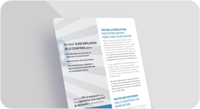 THE SKILLS REVOLUTION: DIGITIZATION AND WHY PEOPLE AND TALENT MATTER WE ASKED 18,000 EMPLOYERS Rarely a day goes by without news of digitization, artificial intelligence and virtual reality impacting the workplace. IN 43 COUNTRIES Business leaders, politicians and economists want to quantify ABOUT: technology’s impact on employment — but no one knows • The likely impact of automation on for sure what the outcome will be. Plenty has been written headcount in the next two years predicting the future: more jobs, different jobs, less jobs, even no jobs. But few are telling people that they will need • Which functions will be most affected new skills and they will need them more often to stay Q employable for jobs we may not even have heard of yet. • The strategies they are adopting to ensure they have the skills they need This report presents new findings with fresh insights on the for technological advances near-term. As world of work experts, we find work for 3.4 million people and have nearly 30,000 employees advising 400,000 clients on hiring decisions and skills development every year. We wanted to know how ready employers are for the Skills Revolution. We asked 18,000 employers in 43 countries across six industry sectors how they expect technology will impact their business in the next two years, and how they are ensuring their workforce has the right skills More than 90% of employers expect and is ready to adapt. their organization to be impacted in the next two years by digitization FASTER AND DIFFERENT: SKILLS DISRUPTION LIKE NEVER BEFORE Up to 45% of the tasks people are paid to do each day could 1 be automated with current technology. Of course we have adapted to the evolution of the labor market before — from tellers to customer service representatives, typists to word processors and personal assistants — disrupting, destroying, redistributing and recreating work is nothing new. The difference now is the life cycle of skills is shorter than ever and change is happening at an unprecedented scale. The impact may be hyperinflated today, but as the cost and complexity of implementing technology falls, the pace is set to accelerate. We need to be ready for the Skills Revolution. 1 Where Machines Could Replace Humans – and Where They Can’t (Yet), McKinsey (2016) Digitization and Why Skills and Talent Matter | 3